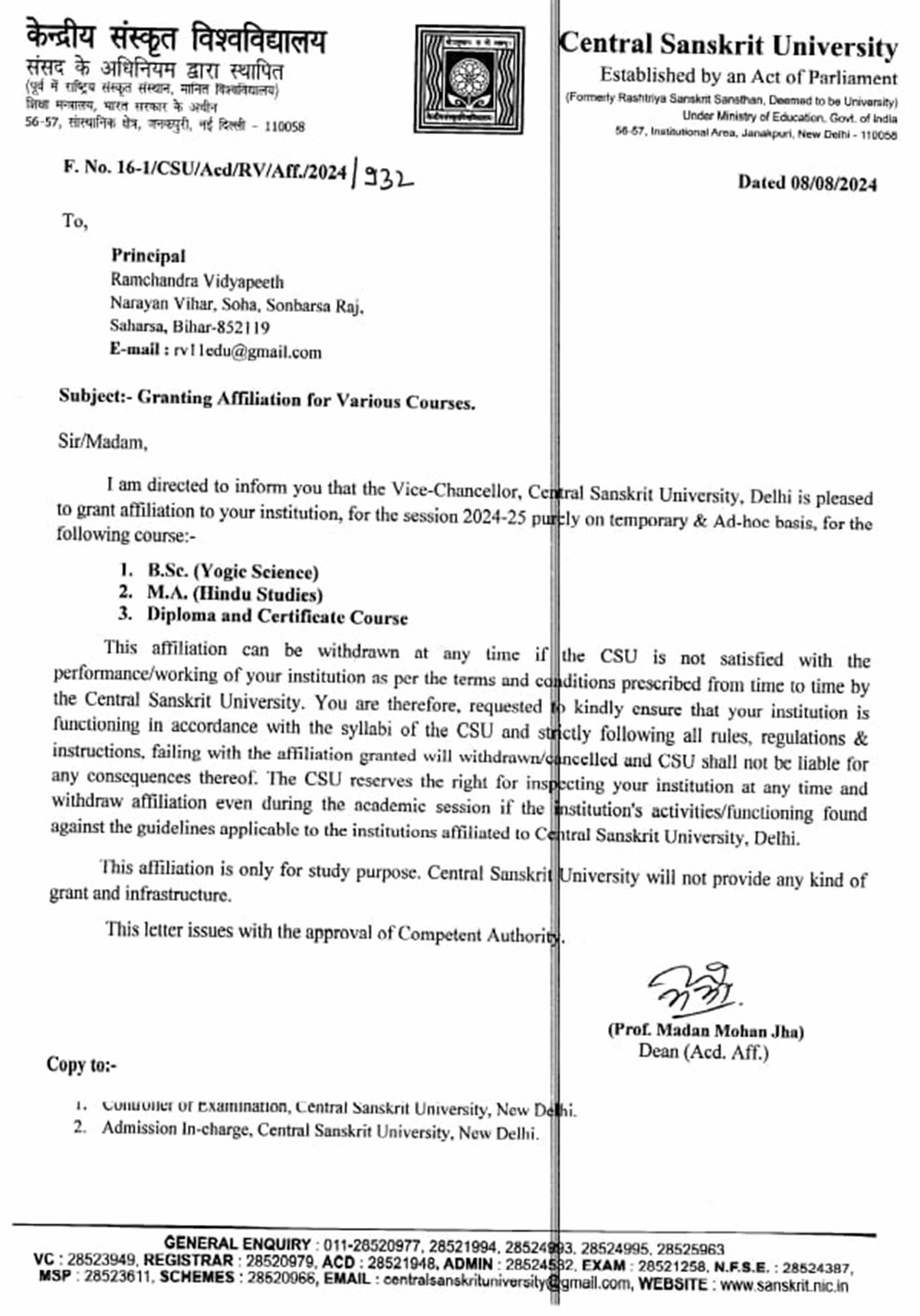 Central Sanskrit University Affiliation Letter